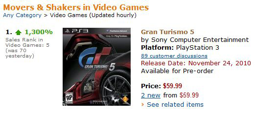 Ожидаемые продажи на этой недели 2.4-2.5 млн копий, что практически равно продажам Gran Turismo 4 на PS2 в первую неделю. GT5 пятая по продажам в первый викенд игра на PS3, следует по порядку за Black Ops, Modern Warfare 2, FF13 и GTA4. GT5 в Европе показала первое место практически во всех странах, кроме Англии (где CoD, GTA и FIFA все таки ее опередили).