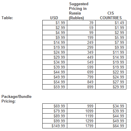 В августе, Valve сообщили, что вскоре собираются переходить на рубли. И вот момент настал. Вследствие этого цены снижены(таблица ниже) и возможность оплачивать долларами на территории СНГ убрана.