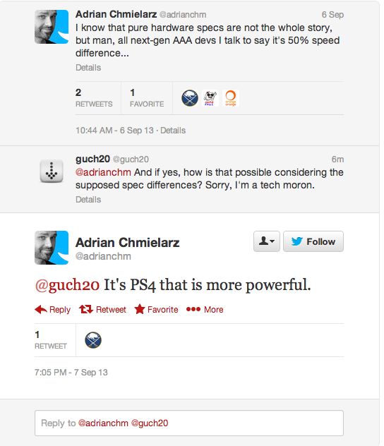 Совсем недавно бывший креативный директор студии People Can Fly - Adrian Chmielarz, который принимал участие в создании таких игр, как Gears of War Judgment, Bulletstorm и Painkiller, со своей твиттер страницы рассказал всему миром о том, что все-таки, несмотря на пустые слова балабола Майора Нельсона, в битве настоящих некстген консолей (нентендо-огрызок - Wii U, к ним не относится ), Xbox One является самой хилой и недоразвитой консолью. И естественно Эдриан Хмиералз признал, что PS4 является самой мощной консолью из ныне существующих.