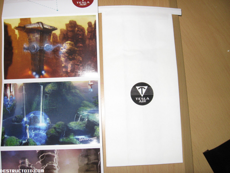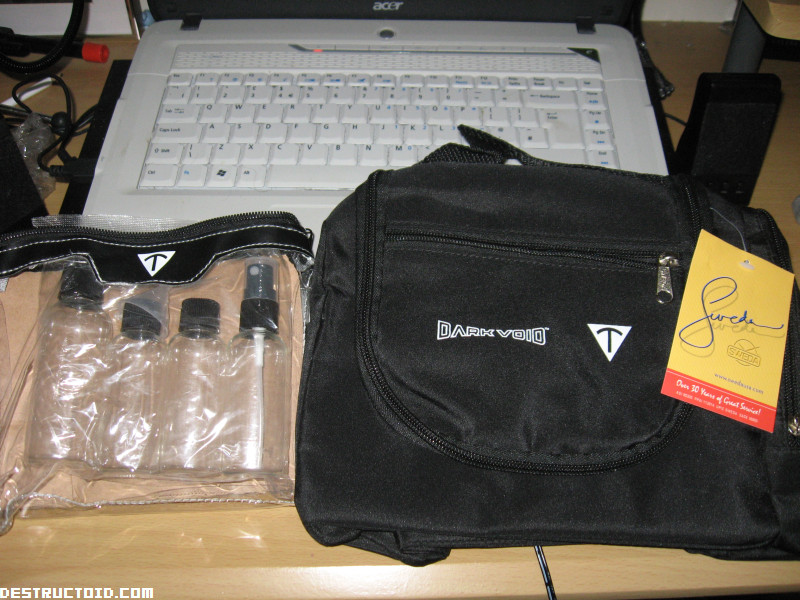 На этот раз под наш зоркий глаз попала игра Dark Void, которая на днях уже будет лежать на прилавках магазинов по всему миру. Чтобы получить хорошие оценки, разработчики игры, Capcom, решили подарить журналистам спальный набор, состоящий из "ночнушки для глаз", упаковок для шампуня и шикарненькой сумки. А также в комплекте содержаться прочие побрекушки, навроде артов и наклеек, посвященные разного рода игровым корпорациям. И это только для V.I.P. журналистов, для обычных журналистов, на которых Capcom положить, приготовили специальный пак из простенькой сумки и специальной инструкции "Как не нужно летать в Dark Void".