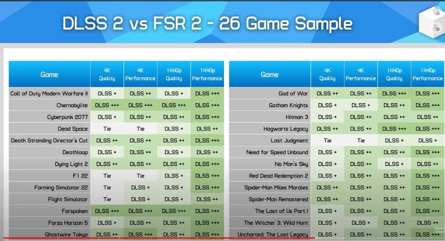 DLSS 2 сравнили с FSR 2 в 26 играх