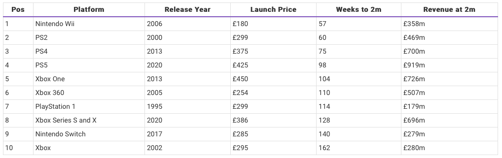 По данным GfK, это восьмая самая быстро продаваемая домашняя консоль, достигшая этой цифры. Она на одно место опережает Nintendo Switch, которая достигла двух миллионов продаж за 140 недель.