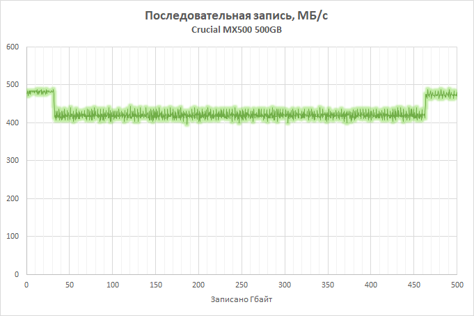Даже ультрабюджетное говно может весь свой объём превратить в SLC и очень долго записывать данные с хорошей скоростью ( это сата, так что 400 мб хорошая скорость для него ).