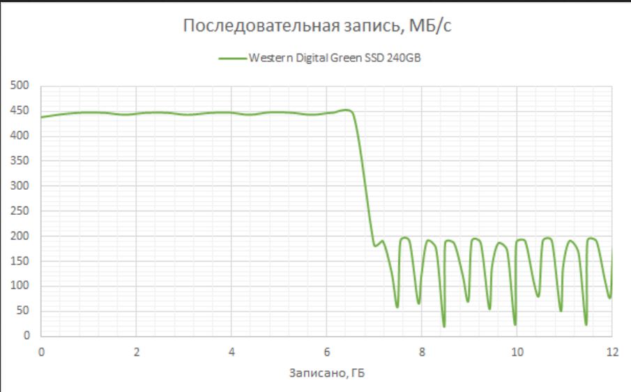 Тебе напомнить как ведут себя бюджетные ссд, у которых кончается кэш? Вот как на скрине, а этот до упора пишет на высокой скорости, почти без просадок.
