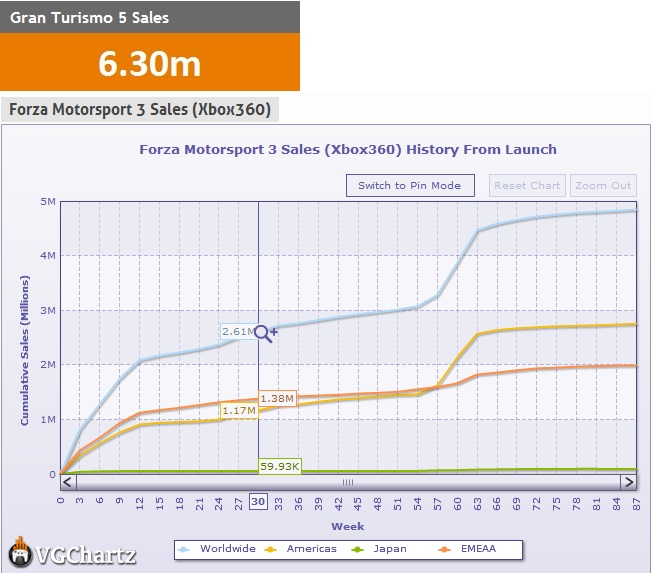 И так спустя 30 недель после релиза продажи GT5 Достигли 6.30 млн. Продажи форзы 3 за первые 30 недель после релиза были на отметке 2.60 млн.