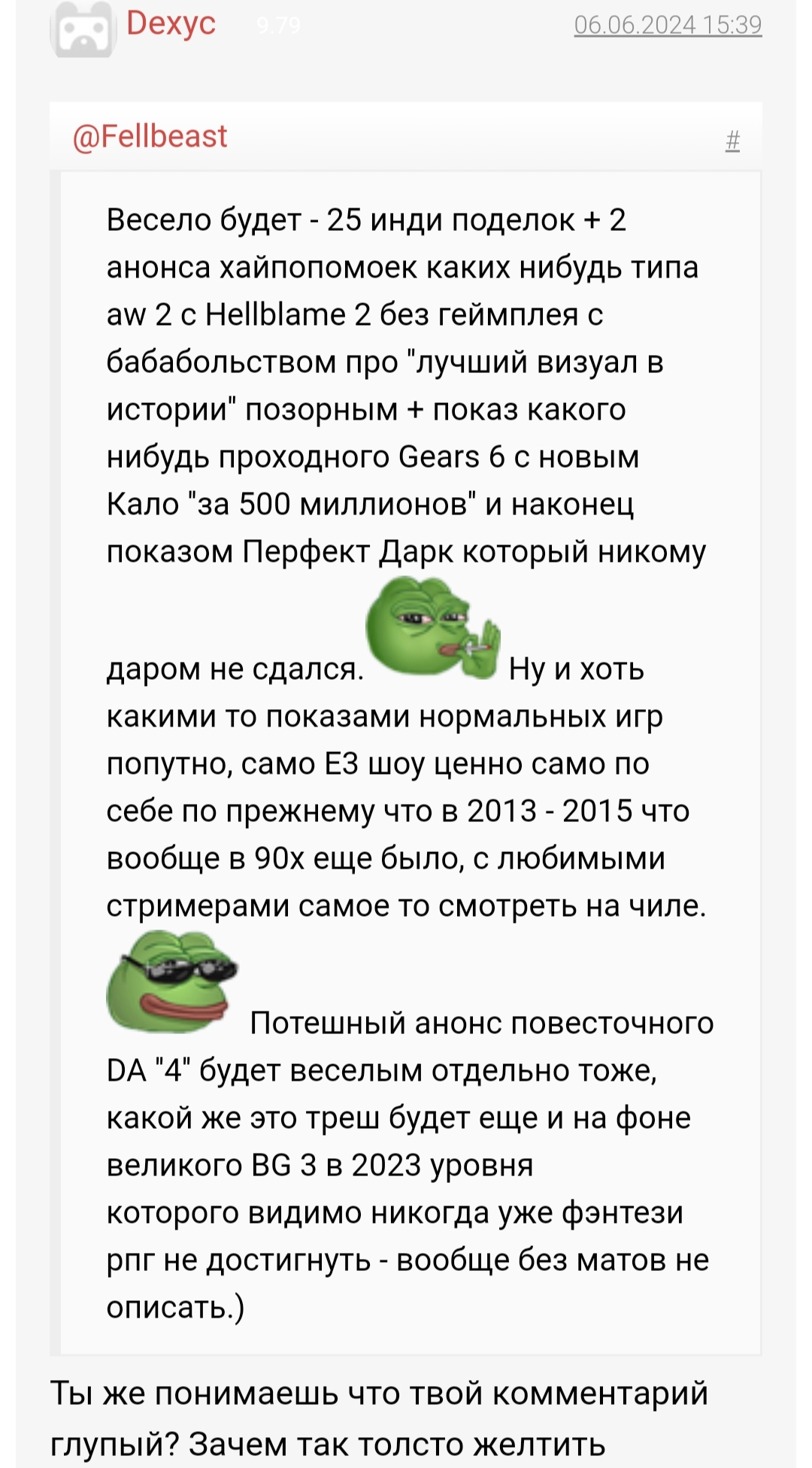 Весело будет - 25 инди поделок + 2 анонса хайпопомоек каких нибудь типа aw 2 с Hellblame 2 без геймплея с бабабольством про ''лучший визуал в истории'' позорным + показ какого нибудь проходного Gears 6 с новым Кало ''за 500 миллионов'' и наконец показом Перфект Дарк который никому даром не сдался.Изображение Ну и хоть какими то показами нормальных игр попутно, само Е3 шоу ценно само по себе по прежнему что в 2013 - 2015 что вообще в 90х еще было, с любимыми стримерами самое то смотреть на чиле.Изображение Потешный анонс повесточного DA ''4'' будет веселым отдельно тоже, какой же это треш будет еще и на фоне великого BG 3 в 2023 уровня которого видимо никогда уже фэнтези рпг не достигнуть - вообще без матов не описать.)