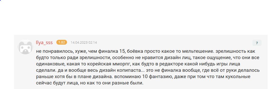 В любой фф 10 часов диалогов и катсценChris писал(а): 15 апр 2023, 02:1230% времени смотрим кинцо за 80 евро, какие-то флешбеки на МГС 4.