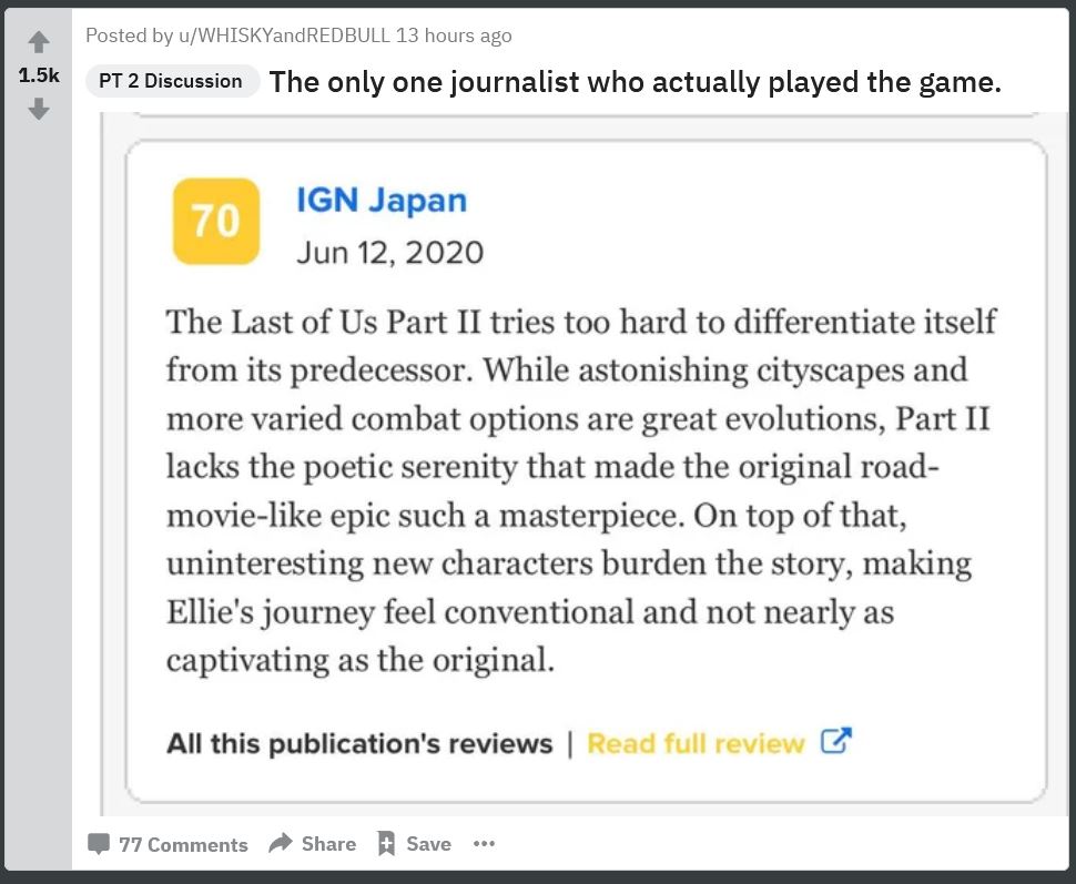 конечно ты сейчас вскукарекнешь, что тлоу2 сжв накрутили, но там нет никакого сжв, а айтипедия вообще говорил, что у сжв подгорит от сюжета. так что вероятно сжв скам опять занизил оценку Сонишедевру и без него было бы не 95, а 98-99 что было бы адекватно