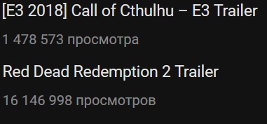 Red Dead Redemption 2: Official Gameplay Video Part 2 (1 окт. 2018 г.) - 1 157 655 просмотров. За 3 дня соберёт просмотров больше, чем ктулху-говно за полгода.