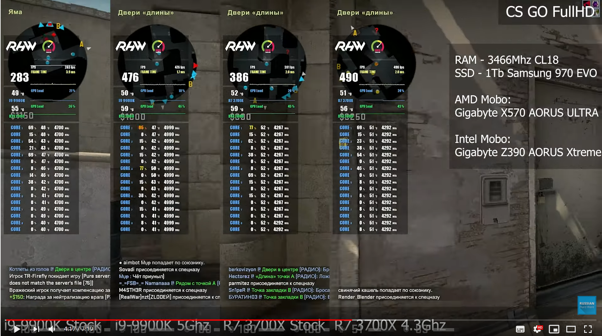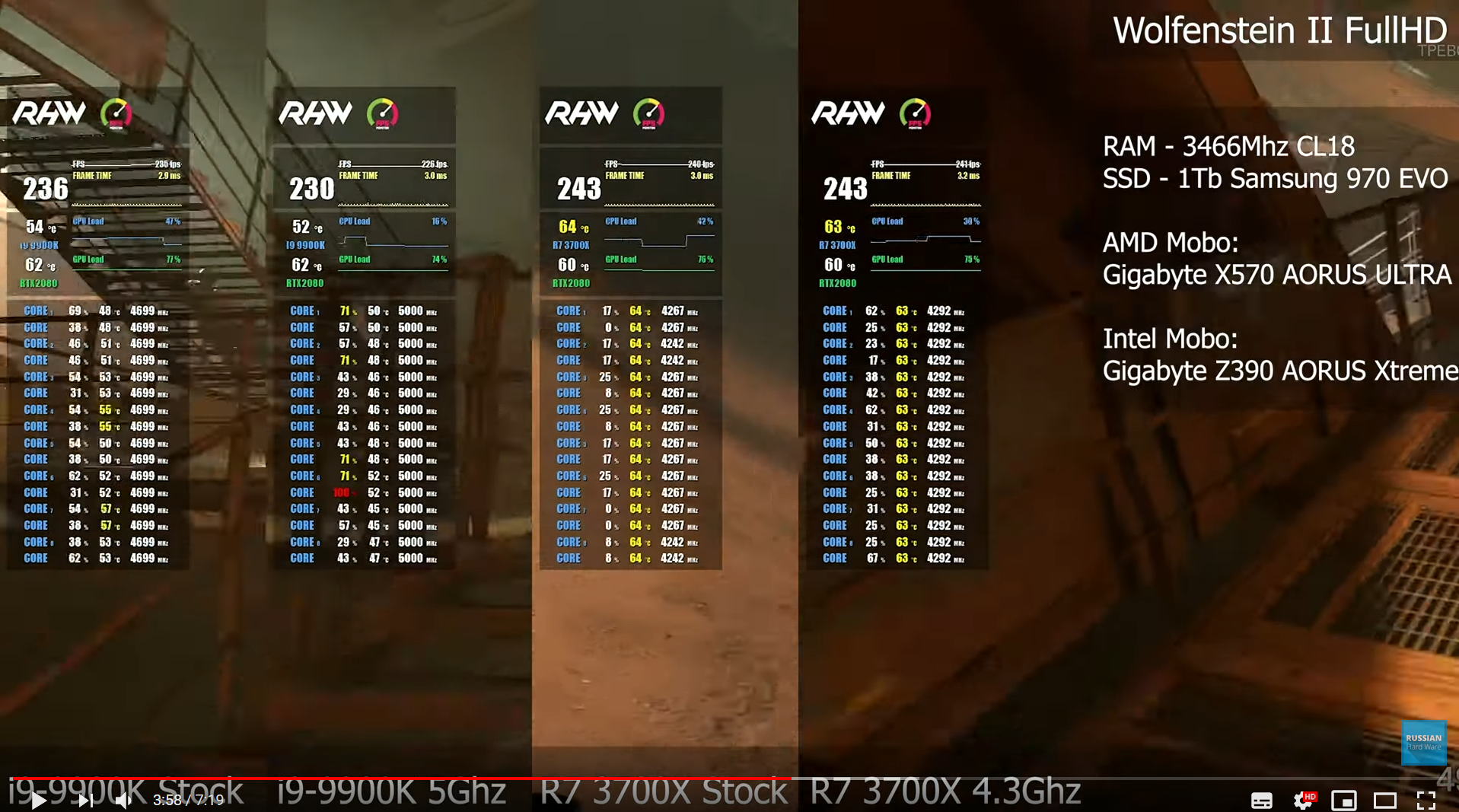 Тем временем райзен 3700Х без разгона рвёт 9900к с 5 ггц по всем ядрам в вульфенштейн 2 и КС ГО