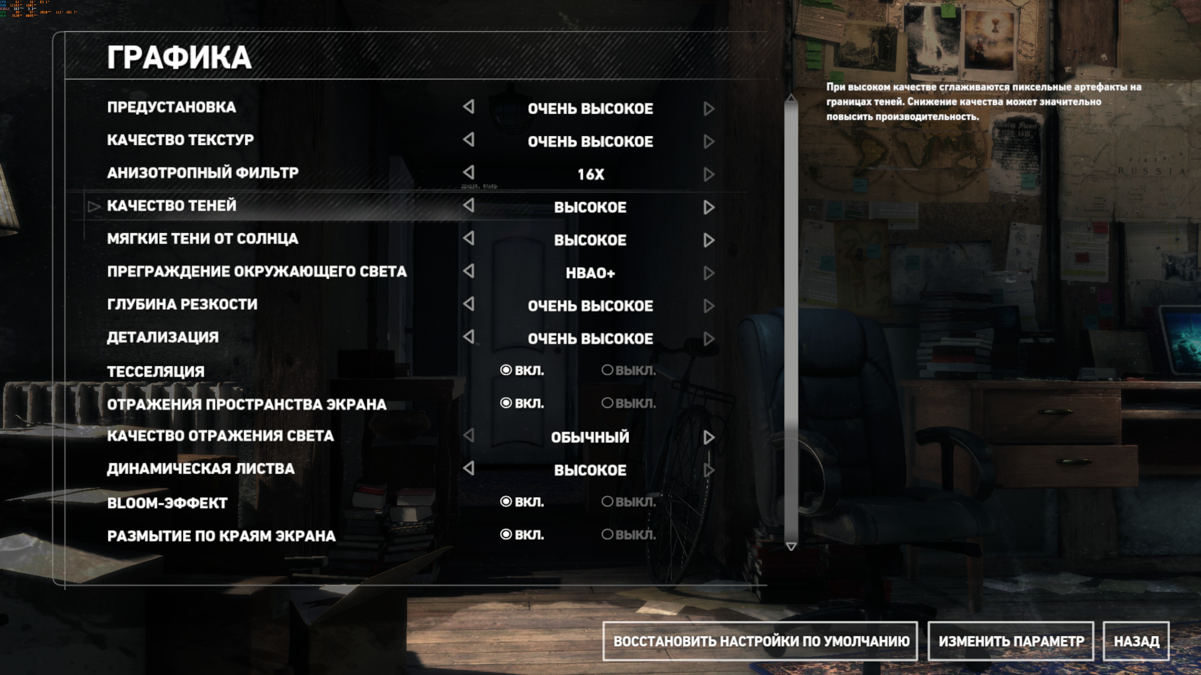 Я поставил все ультра. Выбрал ультра-пресет, включил Screen space contact shadows на выcокие (место средних) + анизотропную фильтрацию поставил на 16X, место 8X