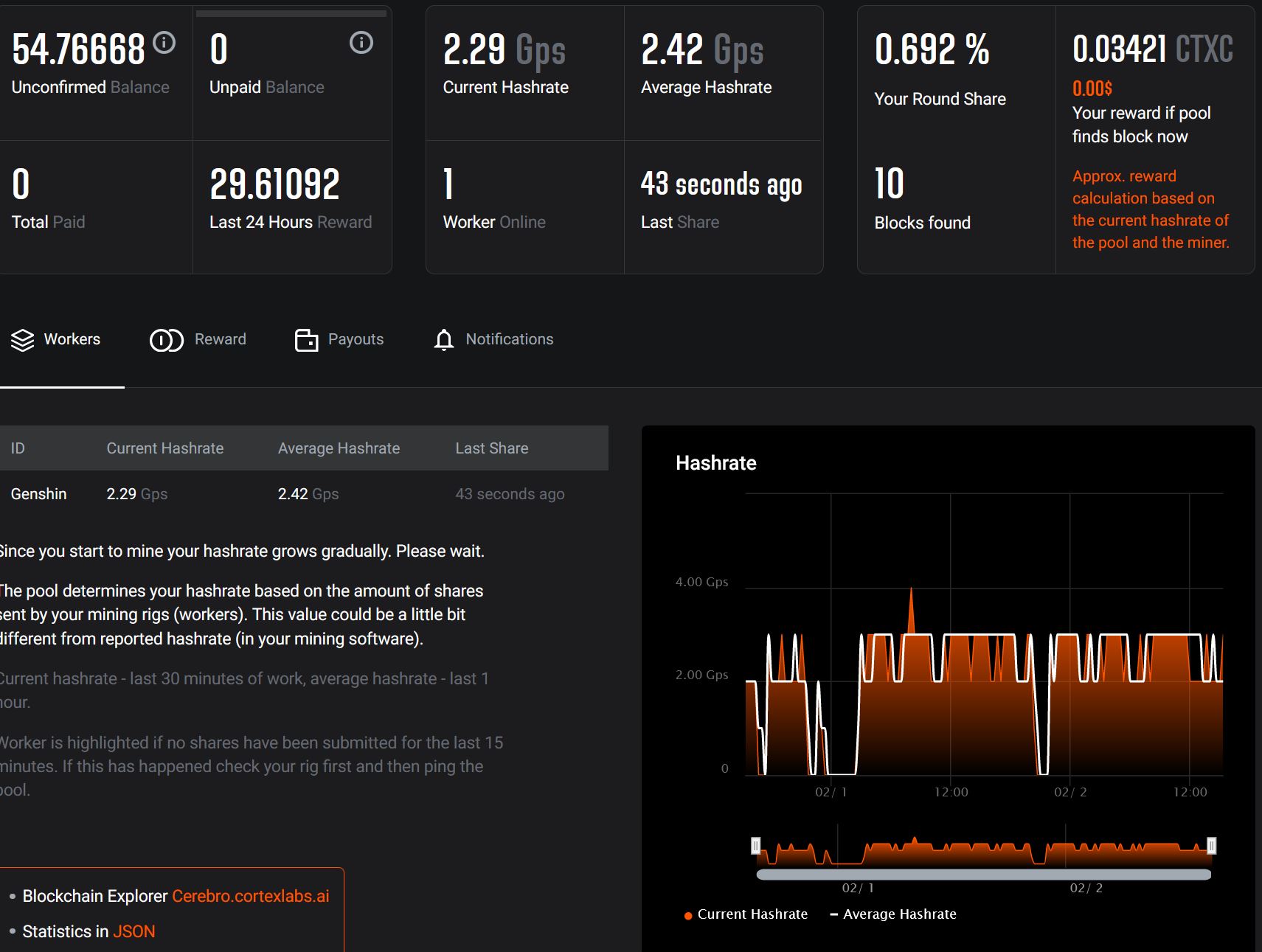 Я вырубал майнинг на час или даже больше, что видно на графике. Всё равно вышло 29.5 монеток по курсу 0.122$, что 3.6$