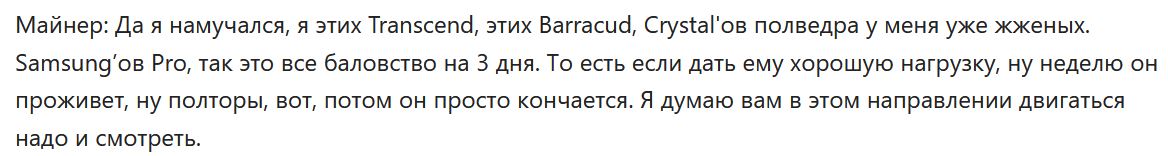 По непроверенной инфе, объём расходуемого tbw раз в 10 превосходит объём итогового плота. Так что если этот ссд способен выжить после записи на него 800 терабайт, вполне. Чем больше планируемые объёмы, тем больше смысла в оптейнах и рамдиске.truth1one писал(а): 25 апр 2021, 05:172000 CAD. не проще взять за эти деньги 8x10tb USB HDD и 1 норм ссд за 400 cad?Chris писал(а): 25 апр 2021, 03:30truth1one, можно не портить ссд и купить серверную память по 32 гига 16 планок ( хватит 13 ), вставить в эту плату с дешевыми ксеонами. Записать хоть петабайт с рамдиска.