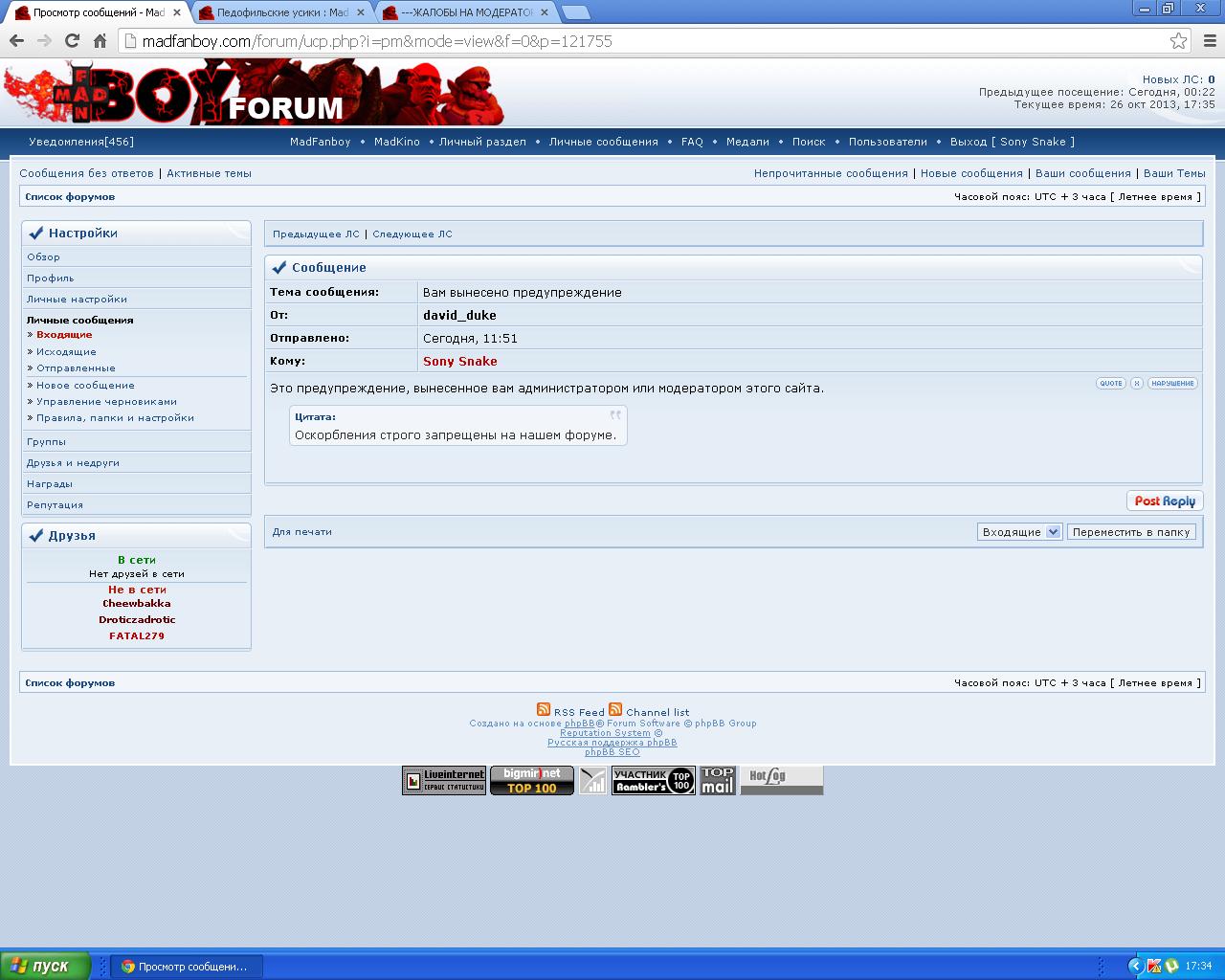 Фанлост сказал, что говно моя еда, я ответил "кушай" и он выдал мне пред. Фанлост не получил ничегоmihuy писал(а):Это предупреждение, вынесенное вам администратором или модератором этого сайта.Это предупреждение, относящееся к следующему вашему сообщению: https://ru.madfanboy.com/forum/viewtopic.ph ... 8#p2134598.