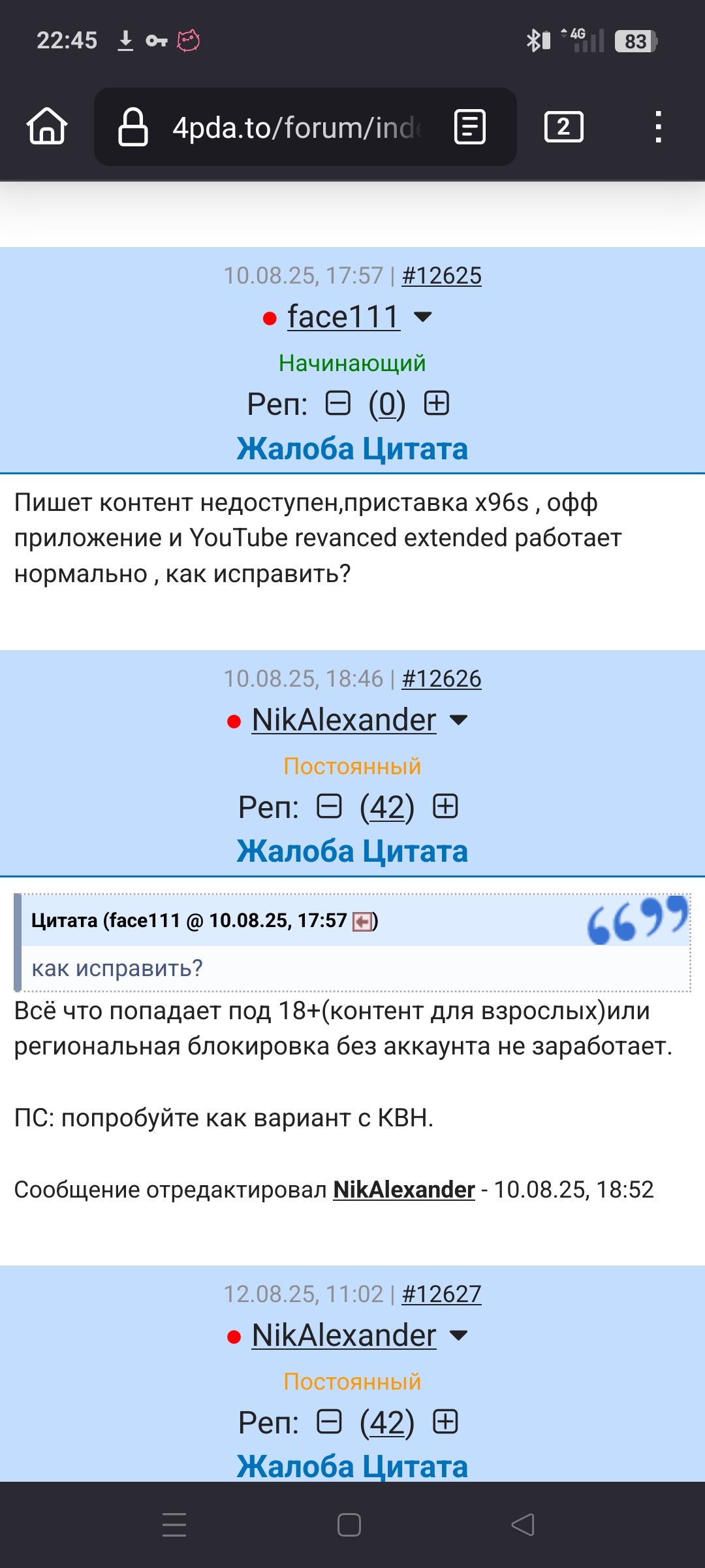 Шиза прогрессируетupgrayedd писал(а): 14 авг 2025, 22:25говно советуешь людям. NewPipe ведь.Chris писал(а): 14 авг 2025, 14:20А ещё яблочник не может накатить Youtube ReVanced без рекламы и с оконным режимом с 4pda. Опять на деньги разводят гоев, им придётся платить за то что на Андроиде всем доступно бесплатно, а еблодрочерам только с премиум подпиской.