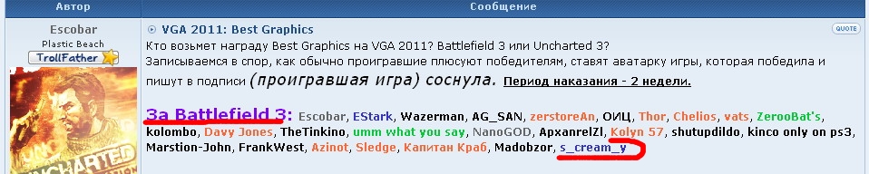 Да да, ты думаешь что кто-то перечитал все 30 страниц, что бы поставить плюс, когда в первом посте есть готовый список?s_cream_y писал(а):вопросы к Ескобару был, я вообще про этот спор забыл, мне ApxanrelZl плюсанул в начале. Вот тут мой пост.Sledge писал(а):Чёs_cream_y писал(а):ПеКаброды Быдлофилды плюсуйте![]()