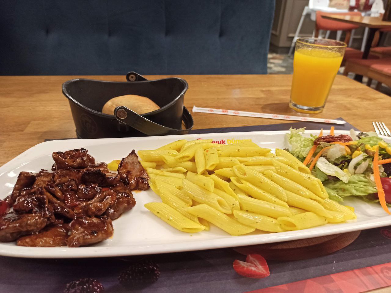 Вот эта тарелка стоила дешевле чем бургер в БК, при этом в разы приятнее для пищеварения ( гастрит не мучал ), вкуснее и сытнее. И на каждом столике бутылки с соусами для салата и мяса, которых можно наливать сколько хочешь. Tavuk Dünyası