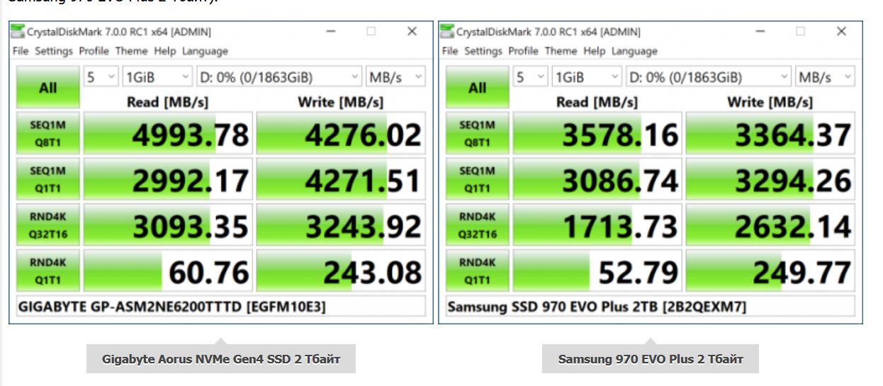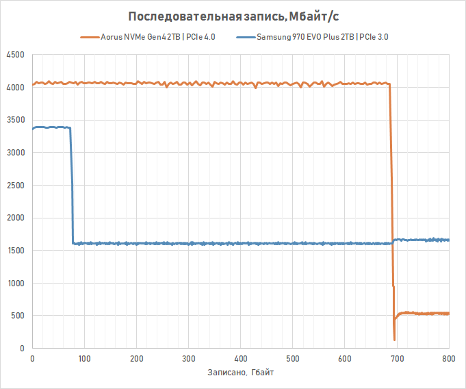 Однако в «родном» TLC-режиме массив флеш-памяти в Samsung 970 EVO Plus оказывается гораздо производительнее. В накопителе ёмкостью 2 Тбайт он обеспечивает скорость записи на уровне 1,3 Гбайт/с, в то время как в Gigabyte Aorus NVMe Gen4 SSD 2 Тбайт скорость записи после заполнения SLC-кеша падает до 530 Мбайт/с.