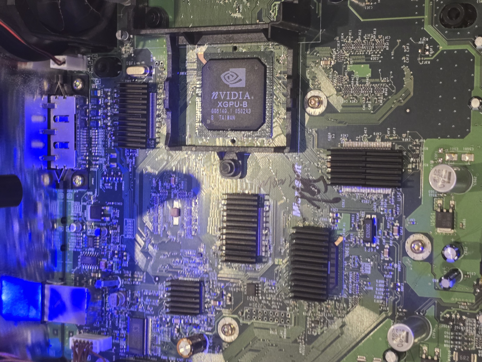 Решил заодно заменить термопасту. С CPU всё легко снялось. Паста с самого чипа полностью вытекла, там вообще не паста а какая-то прокладка вроде резины: Снять радиатор с GPU было сложнее. Пришлось греть феном. Паста такая же резина, только не вытекла: Долго оттерал: Поставил радиаторы на память, чип матплаты, видеодекодер и по ошибке на IO чип (чатгпт мне напиздел): Всё собрал и работает. Грузится xbox с большим диском дольше: Температура с идле упала с 57 до 45