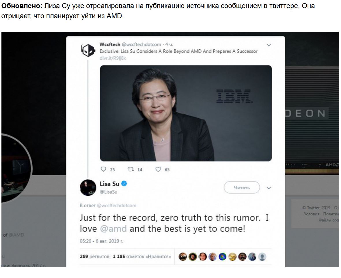 В эксклюзивном материале источник, ссылаясь на собственных информаторов, выдвинул смелое предположение, что генеральный директор AMD Лиза Су (Lisa Su) собирается уйти из компании.