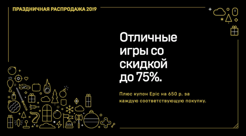 Войдите в вашу учётную запись Epic Games и нажмите кнопку, чтобы получить один купон Epic на сумму 650 рублей. Купон можно использовать при покупке участвующих в акции игр стоимостью 899 рублей или более. Купон Epic на сумму 650 рублей будет автоматически применён при оплате. Примечание: если вы совершите свою первую покупку или получите бесплатную игру в рамках этой акции прежде, чем нажмёте кнопку, то первый купон Epic на сумму 650 рублей будет выдан вам автоматически. Купоны действуют до 1 мая 2020 года, 10:59 по московскому времени.
