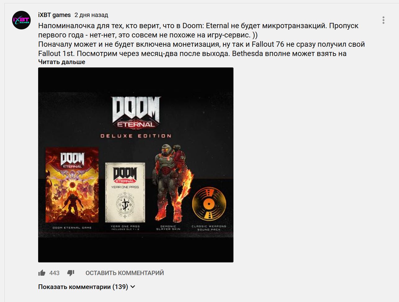 Беседуя со своими подписчиками в Facebook, творческий руководитель DOOM Eternal Хьюго Мартин ответил на вопрос о микротранзакциях в игре. Если коротко, то их не будет, вообще. Если же подробнее, то, по словам господина Мартина, DOOM Eternal — это игра за $60, а не условно-бесплатный или мобильный проект, поэтому весь контент уже включён в её состав.