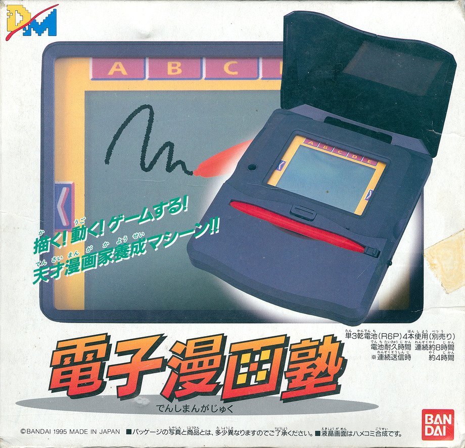 Если верить маркетологам Bandai, их Denshi Mangajukuu стала первой портативной консолью с тачскрином. Она вышла в 1995-м с расчётом на детскую аудиторию. У новаторского продукта полностью отняли кнопки и крестовину, оставив лишь управление стилусом. Библиотека у Design Master была крошечной, хоть и могла похвастаться такими громкими названиями, как Mega Man, Dragonball Z и Street Fighter.