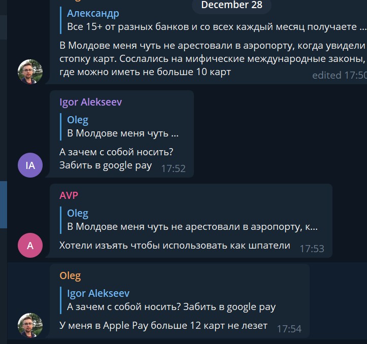 Я думал у тебя больше сотни картChris писал(а): 30 дек 2021, 21:05Больше 12 карт в апл пэй не добавить, у меня в гпэй 28 карт и это не предел. Яблочники как в каменном веке вынуждены таскать с собой пачки банковских карт![]()