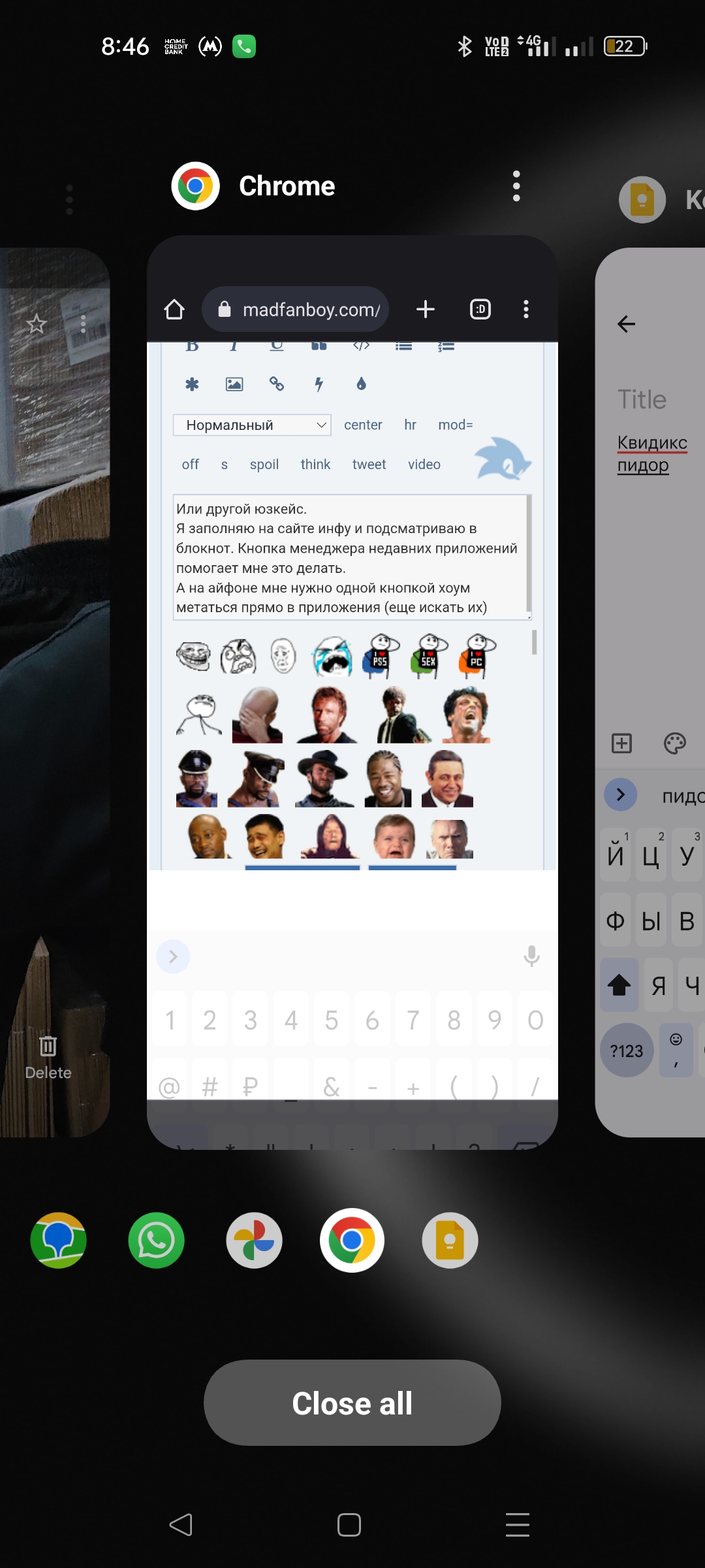 Никак. Два тапа фотку в размер и вниз смахнутьtohdom писал(а): 15 июн 2023, 20:43Ну вот допустим я изучаю фото с приближением и любые движения по экрану ожидаю что будет двигаться фотка. Когда я хочу обратно в галерею, то нажимаю назад.