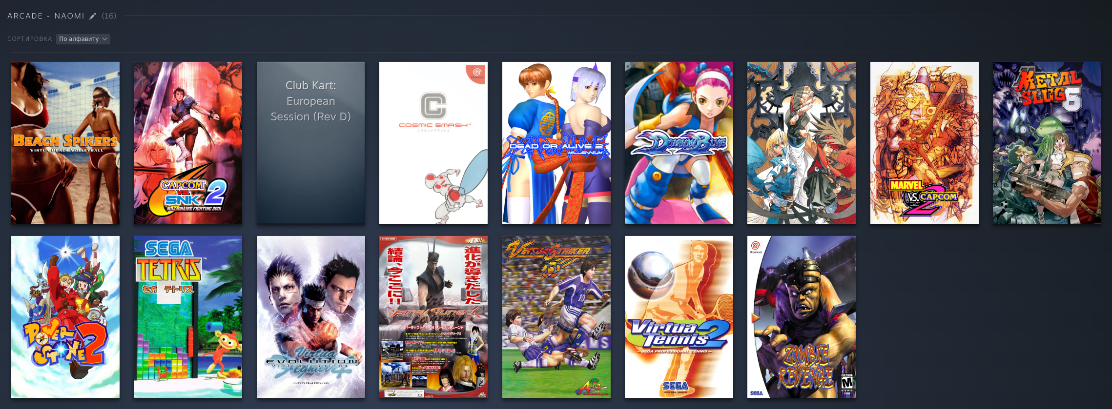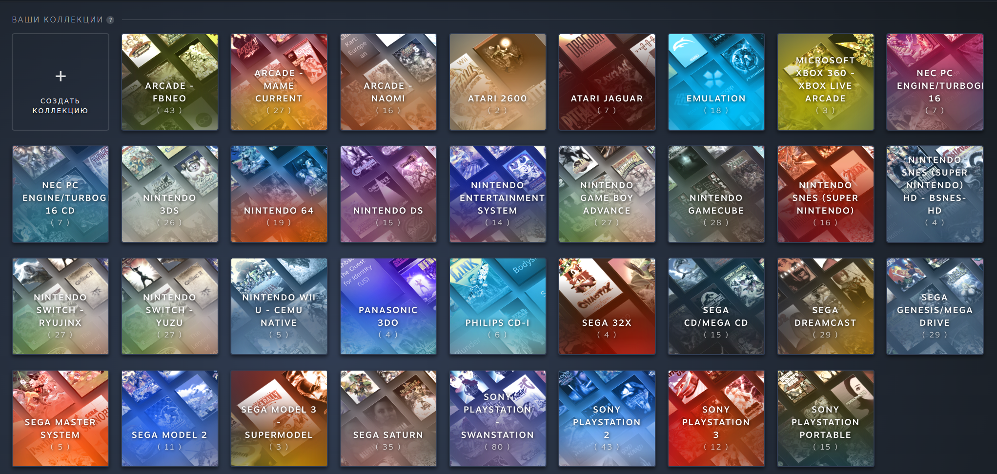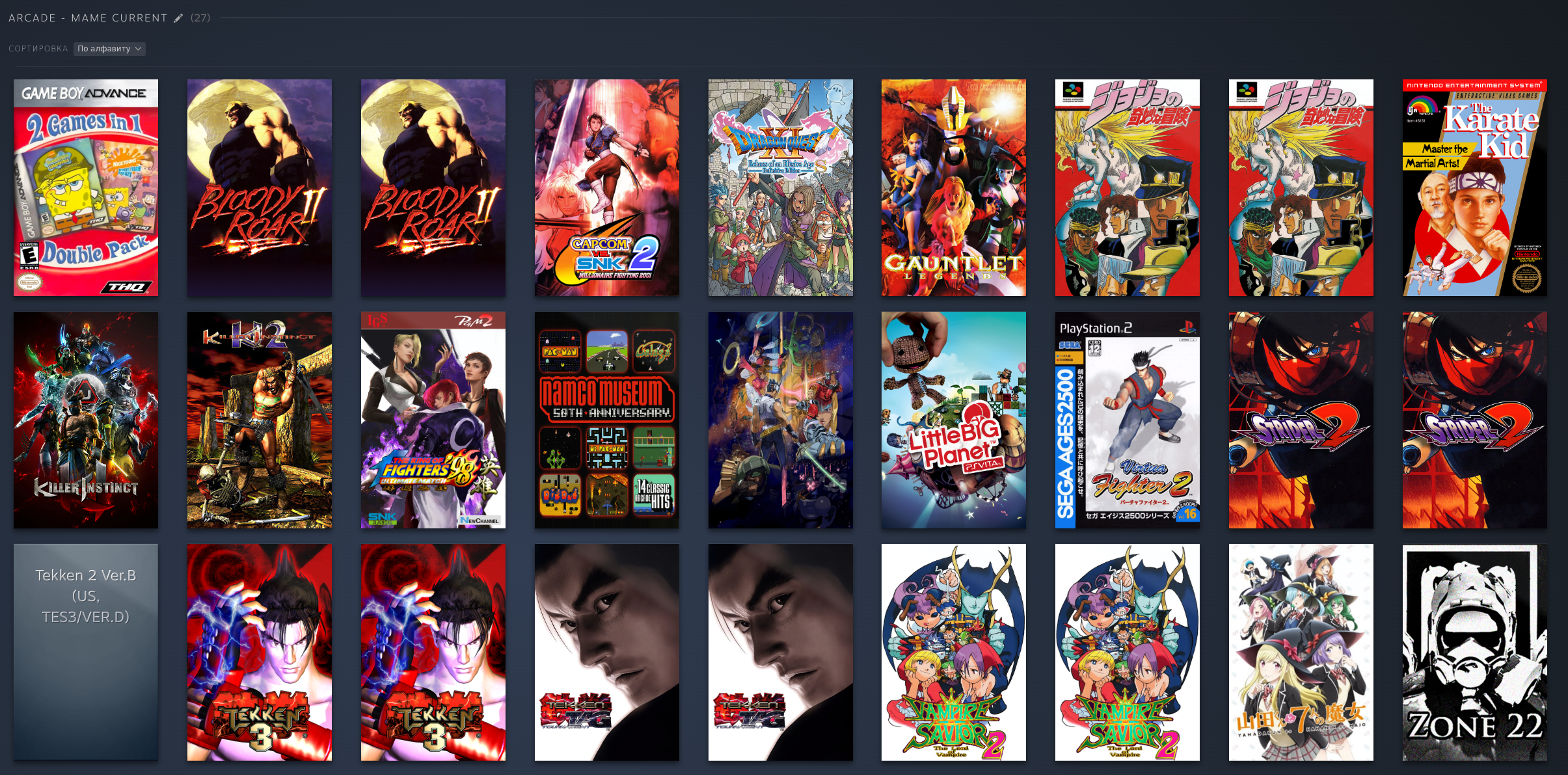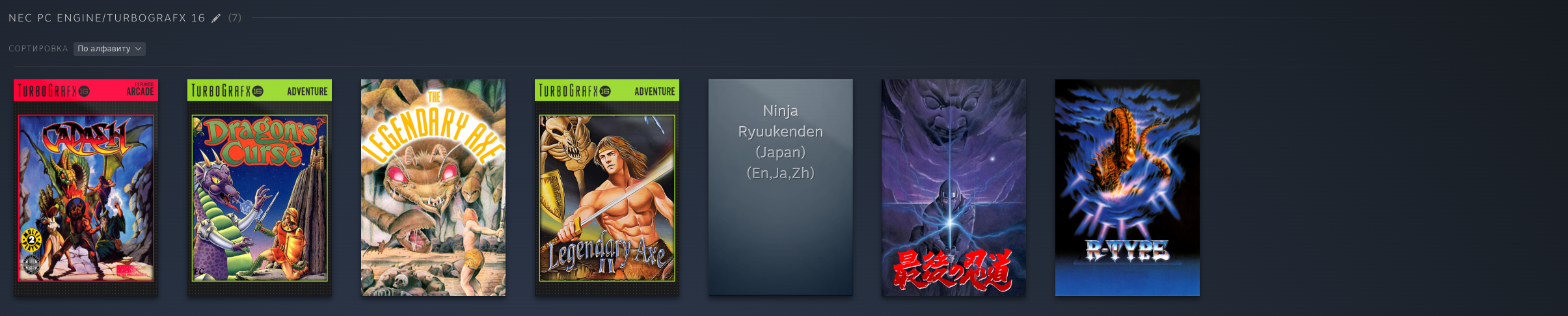 PS1: PSP: PS2: Dreamcast: Saturn: Naomi 1/2: Model 2: Model 3: GameCube: 3DS: DS: Nintendo 64: FinalBurn Neo (Arcade): Mame (Arcade), некоторые обложки не точные: Atari 2600: Atari Jaguar: Xbox 360, многие игры идут хорошо но до 2ч автономность, поэтому многое не добавлял как и с PS3: PC Engine: PC Engine CD: NES (Dandy): GBA: SNES: SNES HD (16:9): Switch: Wii U: 3DO: Philips CD: Sega 32x: Sega CD: Sega Genesis: Sega Master System: PS3: