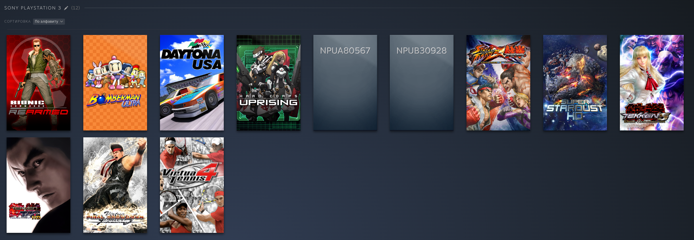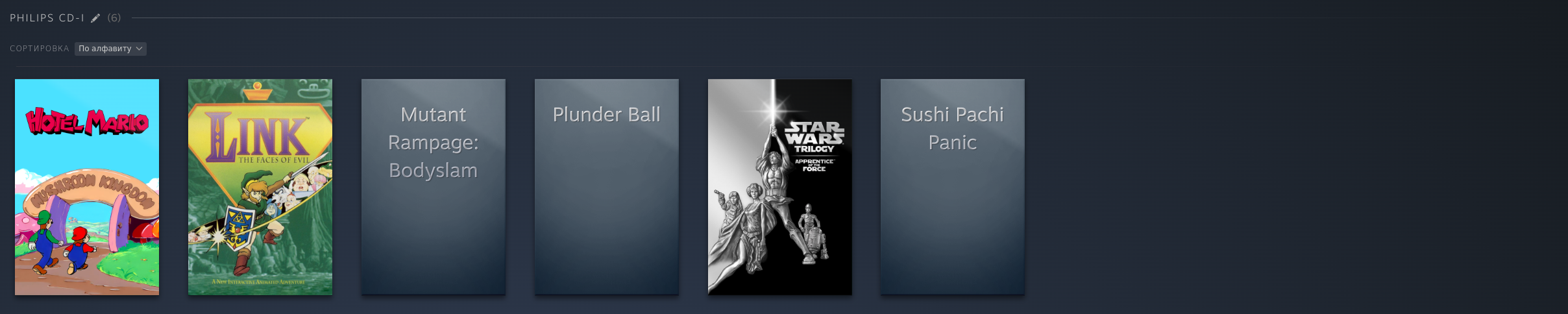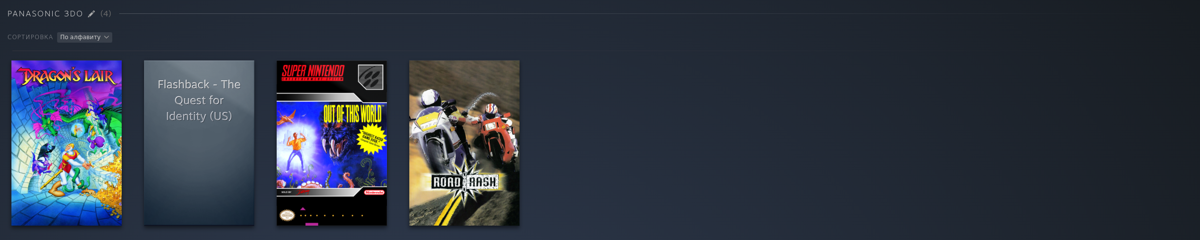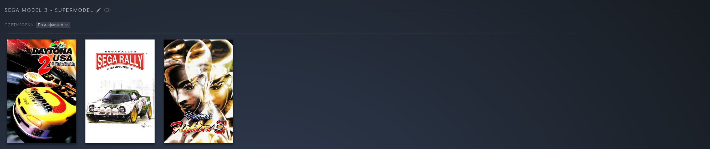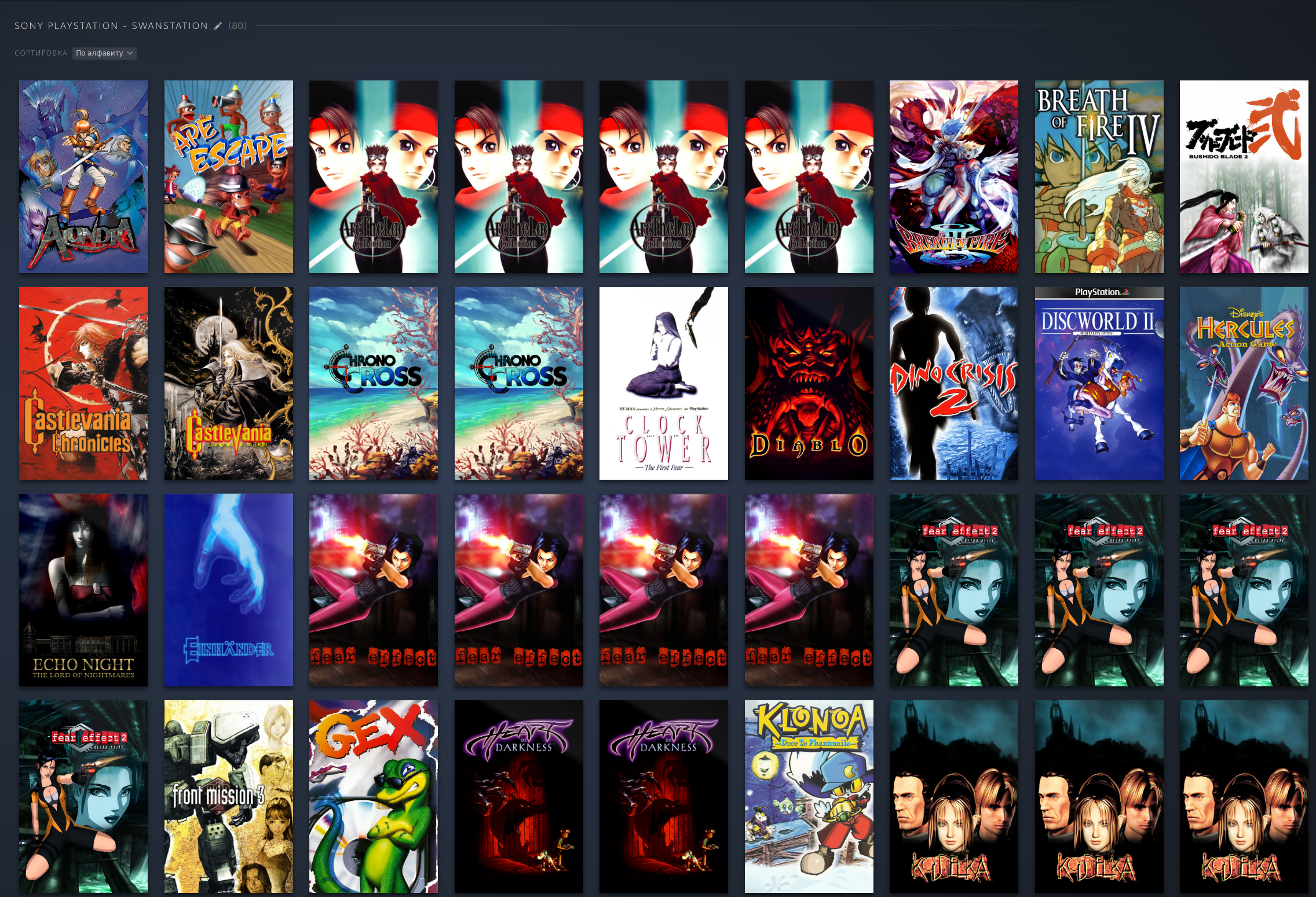 PS1: PSP: PS2: Dreamcast: Saturn: Naomi 1/2: Model 2: Model 3: GameCube: 3DS: DS: Nintendo 64: FinalBurn Neo (Arcade): Mame (Arcade), некоторые обложки не точные: Atari 2600: Atari Jaguar: Xbox 360, многие игры идут хорошо но до 2ч автономность, поэтому многое не добавлял как и с PS3: PC Engine: PC Engine CD: NES (Dandy): GBA: SNES: SNES HD (16:9): Switch: Wii U: 3DO: Philips CD: Sega 32x: Sega CD: Sega Genesis: Sega Master System: PS3: