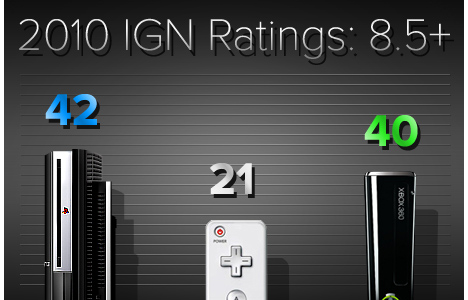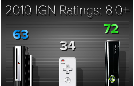По графику понятно, что на Wii недостаточно качественных игр, в отличие от Xbox 360 и PS3. На Xbox 360 в 2 раза больше хороших игр, чем на Wii, которым IGN поставил 8.0+ в 2010. Так же напряженная борьба между PS3 и Xbox 360. PS3 занимает 2 место с 63 играми, и Xbox 360 недалеко впереди с 72 релизами.