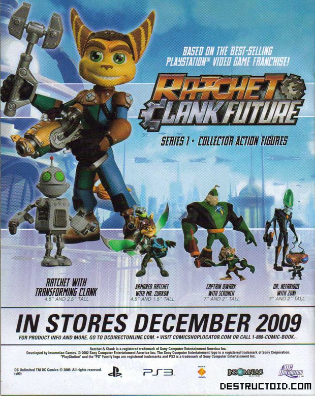Sony и DC Comics объединились для совместного создания первых официальных игрушек в серии Ratchet and Clank, и после того как мы увидели первые фотографии этих игрушек...мы чуть не схватили инфаркт. Мало того, что Ретчет похож на местного таджика, чья ухмылка не вселяет душевности и счастья, так и остальные игрушки выглядят слишком уж ужасно. Нет но вы только посмотрите: