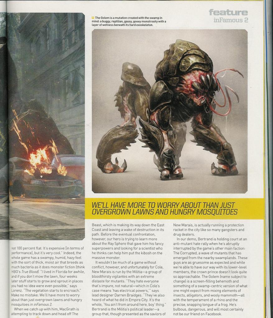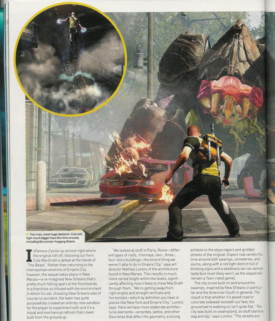 - Собираемые вещи. Nate Fox на Е3 не был готов говорить о данном аспекте игры, но статья PlayStation: The Official Magazine немного приоткрыла завесу тайны. Отдельная часть статьи отведена на представление неизвестного нам до сих пор Dr. Sebastian Wolfe. Доктор живёт в New Marais, и он был одним из учёных, которые ответственны за создание лучевой сферы, которая наделила Коула сверхспособностями. Он отвечал за доставку предметов под названием Blast Cores по всему New Marais, которые, очевидно, дают новые силы Коулу по мере их нахождения. Их будет немного, поэтому можно их рассматривать, как Dead Drops в версии для Infamous 2. Но не волнуйтесь, статья подтвердила, что в Blast Shards вернутся и во второй части. В первой было 350, сколько будет во второй, неизвестно.