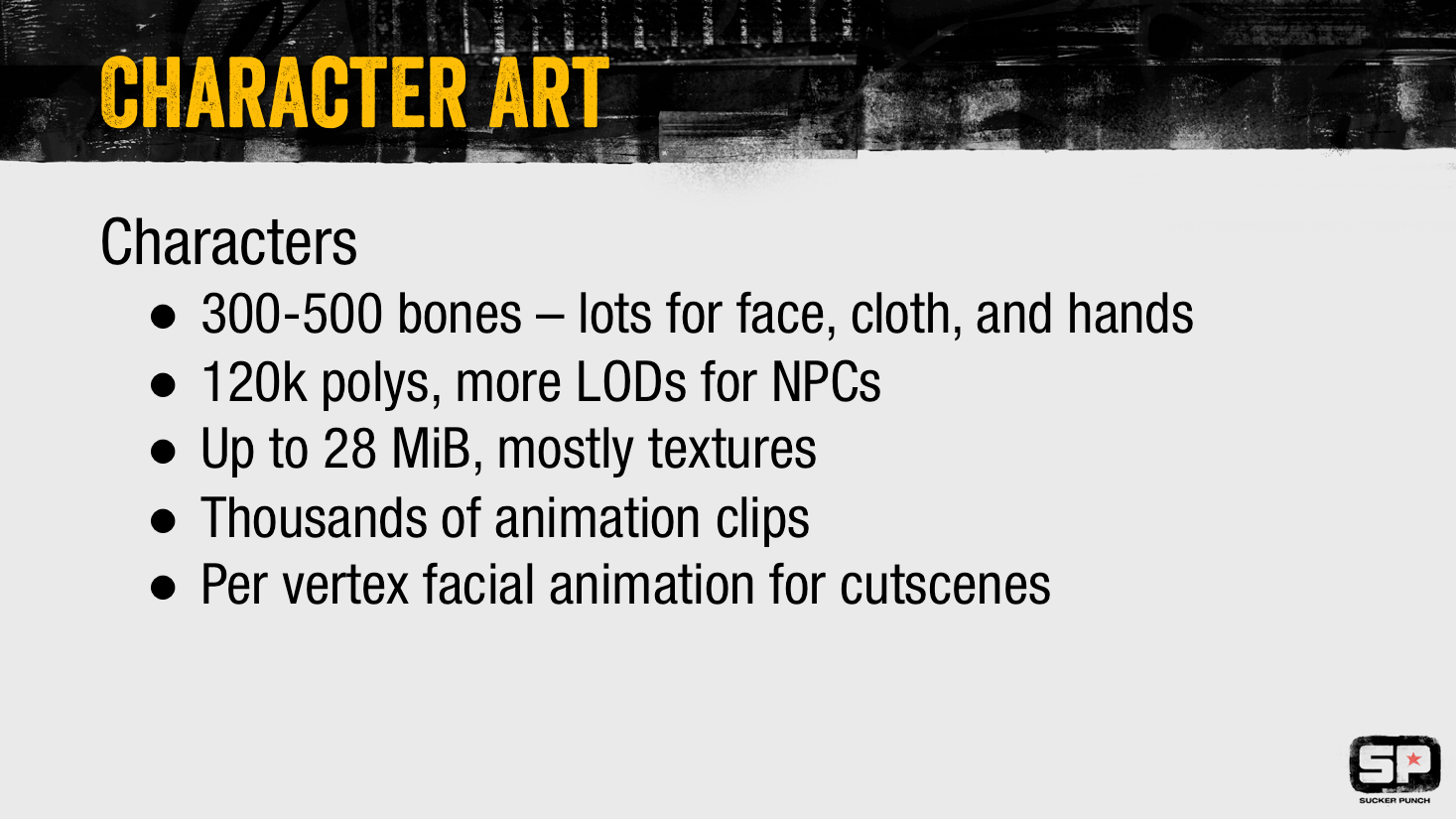 У персонажей от 300 до 500 "костей скелета" для отображения анимации движения, лицевой анимации и одежды, а также сотни анимационных клипов для передвижения персонажей, неиграбельные персонажи состоят из нескольких LOD-ов.