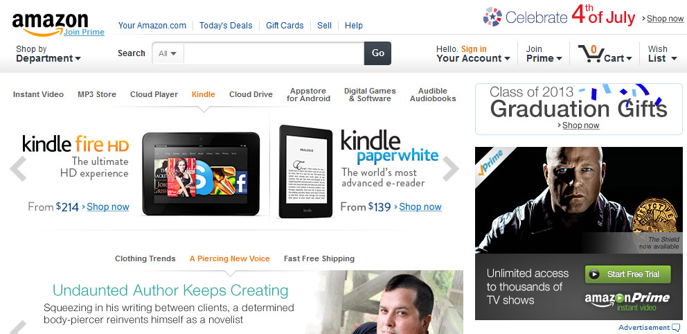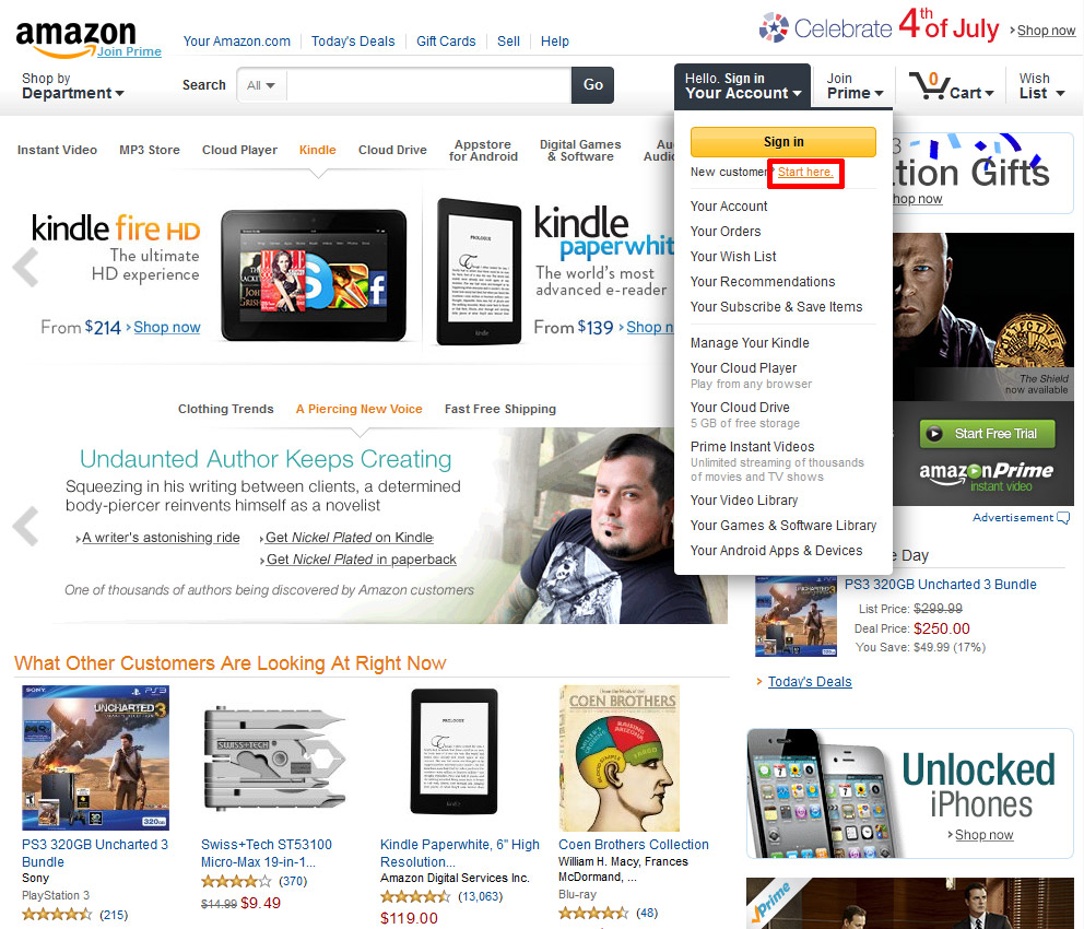 Итак, тыкаем сверху и чуть левее центра надпись "Your Account", в выпадающем меню тыкаем Start here и проходим простецкую регистрацию. Честно говоря, уже не помню, есть ли там подтверждение почтового ящика, но если есть - пройдите в почтовый ящик и перейдите по ссылке в пришедшем письме. Мне тупо лень регистрировать ещё один аккаунт, чтобы освежить воспоминания. Итак, теперь вы авторизованы на сайте.