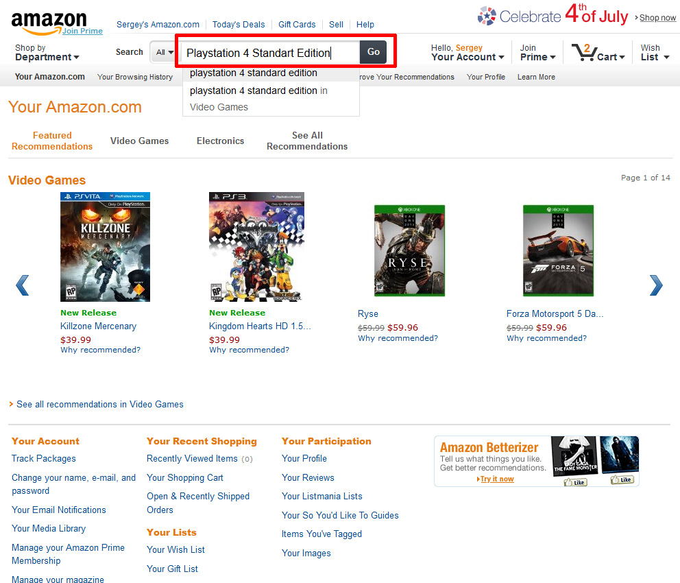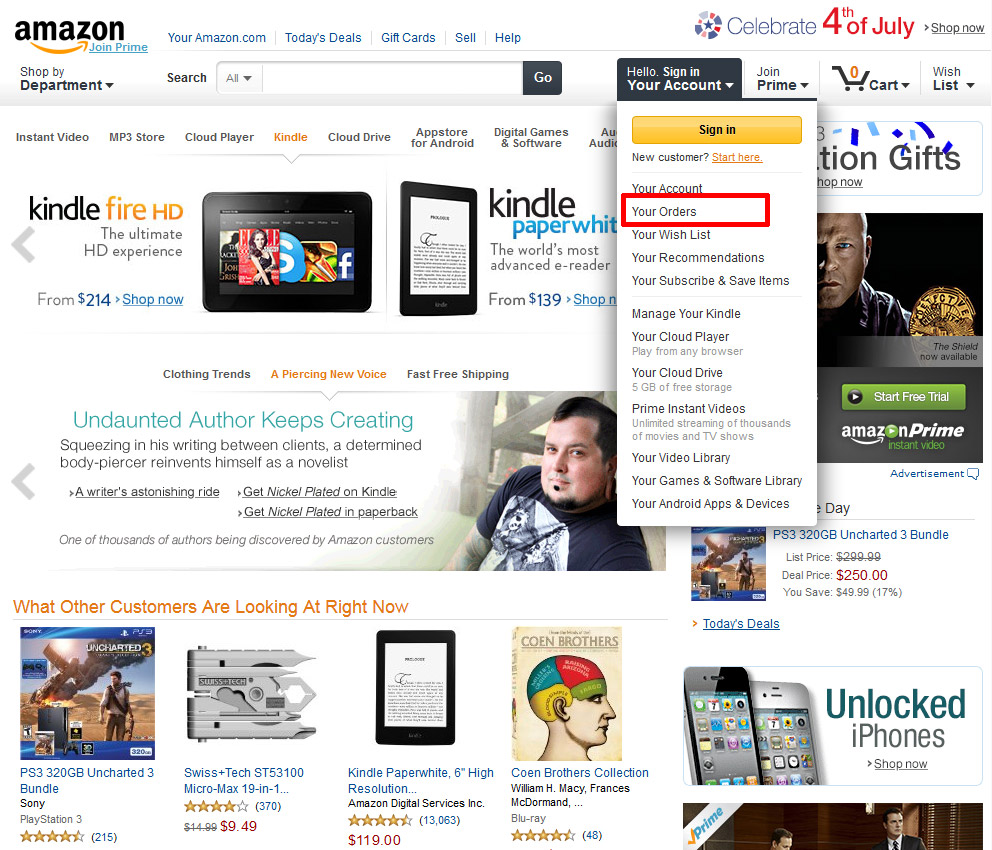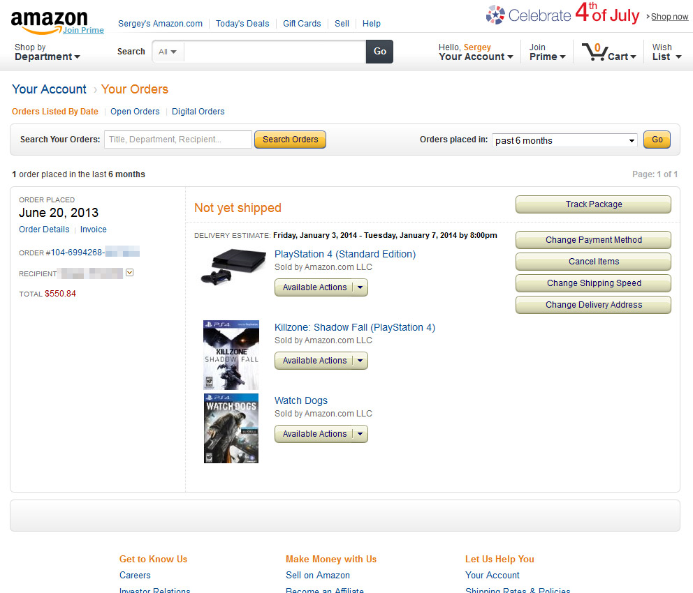 Через меню "Your Account" вы можете попасть на страницу со своими заказами (Your Orders), где увидите только что оформленный заказ на Playstation 4.