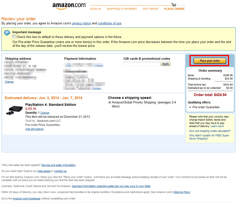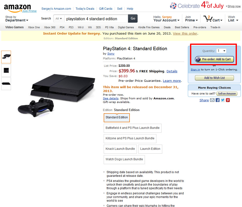 Итак, ищем мы именно Standart Edition и ничего кроме него! Открываем страницу товара и внимательно смотрим на него. Оно? Оно! Имеется строчка: Ships from and sold by Amazon.com - значит это авторизованный магазином товар, а не обманка от частных продавцов (тут ведь торгуют и частники, так что будьте внимательны к наличию этой строчки, она жизненно важна!). Ценник 399.96 баксов, что в наши тугрики по нынешнему курсу доллара примерно 13.000 рублей (напомню, что официальная цена Playstation 4 в России - примерно 18.000 рублей). К осени, если курс доллара упадёт - цена будет ещё ниже. Не обращайте внимания на дату выпуска консоли - 31 декабря 2013 года. Я специально связывался со службой поддержки Amazon и меня уверили в том, что у них пока нет официальной даты запуска консоли от Sony, поэтому дата играет роль обычной "заглушки" для сайта, мол, выйдет PS4 точно до конца текущего года. Не переживайте. Лично я делаю ставку на релиз консоли примерно с 13 по 21 ноября.