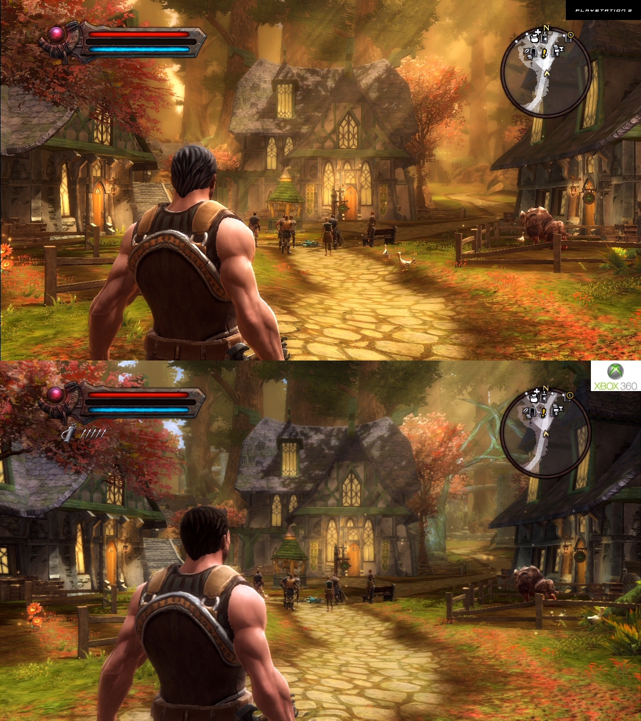 Первое, что бросается в глаза - это огромное различие в текстуре волос героев. При беглом осмотре кажется, что вместо волос в Xbox360 версии сплошная темно-коричневая текстура, однако при более детальном рассмотрении мы понимаем, что просто напросто это такие волосы в фэнтезийном мире специально для владельцев Xbox360. Такие волосы ведь легче делать, правда!?