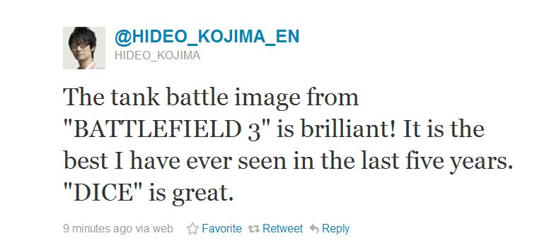 Создатель серии Metal Gear - Hideo Kojima стал большим фанатом DICE. В своем твиттете он написал как ему понравилась Battlefield 3.