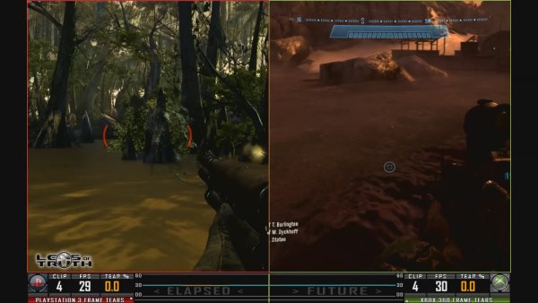 Однако, нельзя не заметить, что Резистенс2 преуспевал и в других аспектах, которые мне тоже следует озвучить. Взять то же нативное разрешение. У Резистенс2 оно 1280х720 с QAA (хотя бионд3д готово с этим поспорить), в то время как у гало временный 2хАА. Хотя при сравнении обеих игр с двух сторон эти различия в разрешении, в общем-то, незаметны, всё равно стоит отметить, что именно динамические эффекты физики жидкостей реагировали наиболее реалистично. Как показано в видео, которое вы сможете лицезреть ниже, когда любое тело проникало в воду в Резистенс2, она реагировала с учётом таких параметров, как скорости, с которой тело в неё проникло, и его массы. Графически Резистенс2 в этом плане даёт прикурить гало с большим отрывом. Но довольно фривольничать насчёт графики, пора перейти к менее наивным делам — к техническому исполнению.