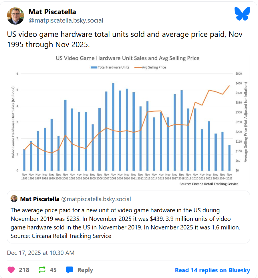 Конкретно консолей продали на 695 миллионов $, что ниже на 27% чем в 2024 и худший результат с ноября 2005 (455 млн $). Если смотреть на количество, то продали 1.6 млн единиц приставок, хуже было только в 1995 с 1.4 млн юнитов.