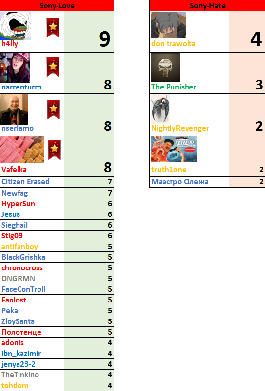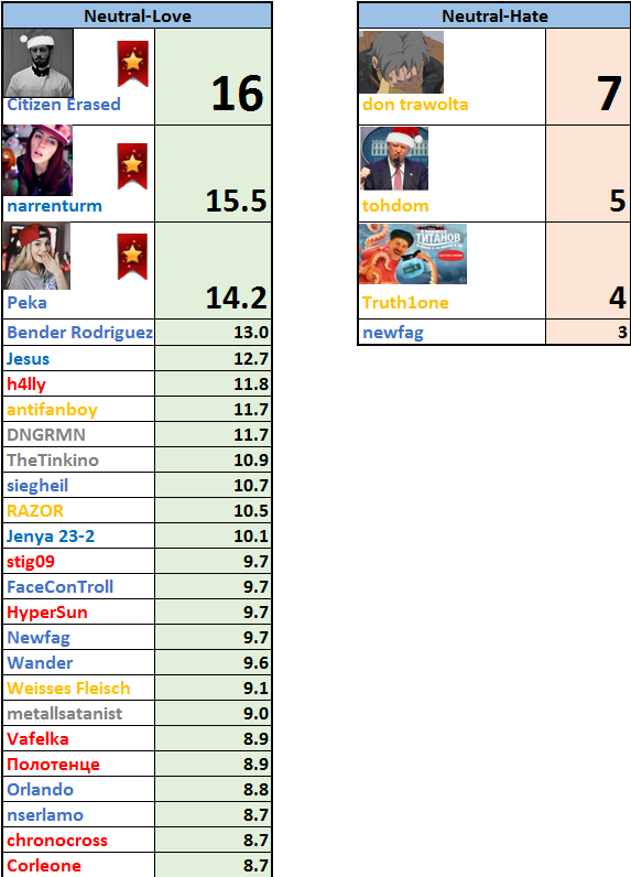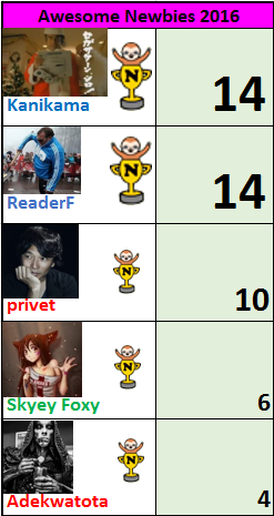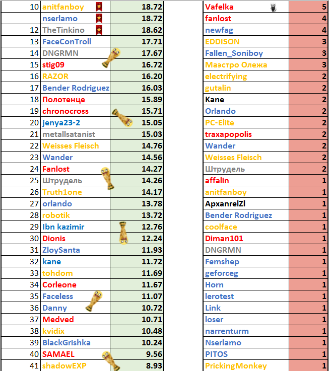 У первого места случился фото-финиш с разницей в менее чем пол балла, поэтому в этом году два победителя. Сорри если чьи-то ники покалечены.