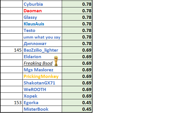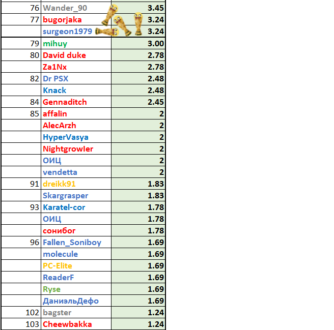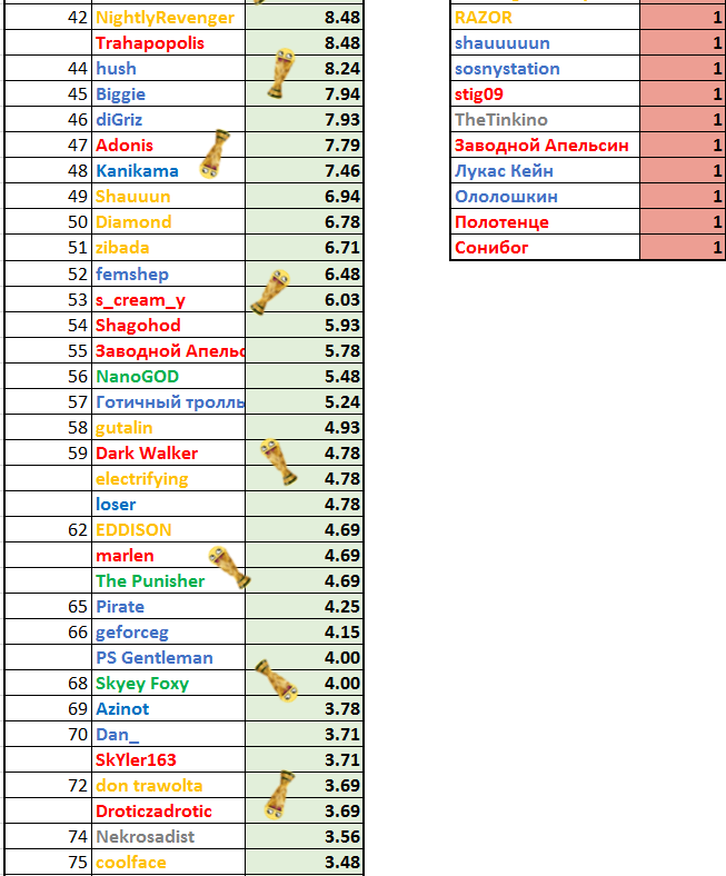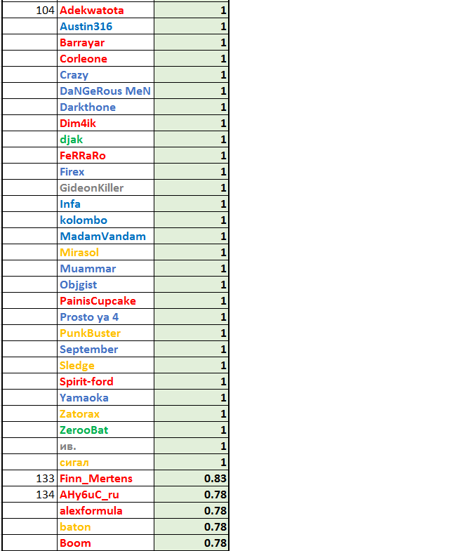 Пояснения к дробным голосам. Максимум список должен был быть 25 ников. Я не стал удалять случайным образом лишнее, а разделил 25 голосов между всем списком.