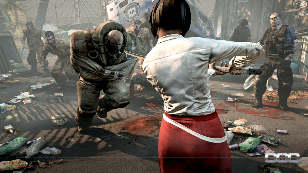 Продолжим разбирать геймплей. Наша героиня метается по отелю и на свою удачу не находит ни одного зомби на своем пути. Потом, конечно, же голливудский прием с лифтом, таинственный незнакомец с благими намерениями и RUN! Бегущая безоружная сучка от стаи голодных бомжей-зомбарей. Кстати, бегает она ужасно. Если вы видели тень, то, наверно, догадались, что Techland не заморачивались над анимацией того, что не видно, и главный герой, естественно бегает так же, как и быстрые зараженные. Браво! Халтура намба ту.