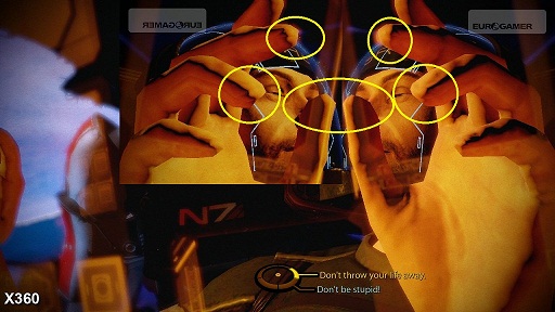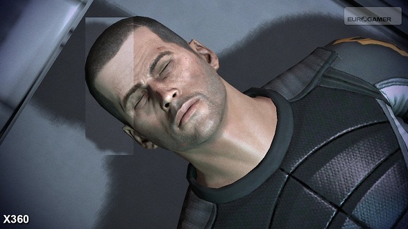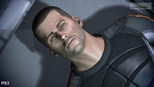 Как и обещал, вернемся к теме о динамическом освещении. Шепард очнулся на операционном столе, на него светит прожектор, но это правомочно только в ПК и XBOX 360 версиях. Заодно, обратите внимание на качество текстур жилета, которое пытались скрыть убрав это освещение.