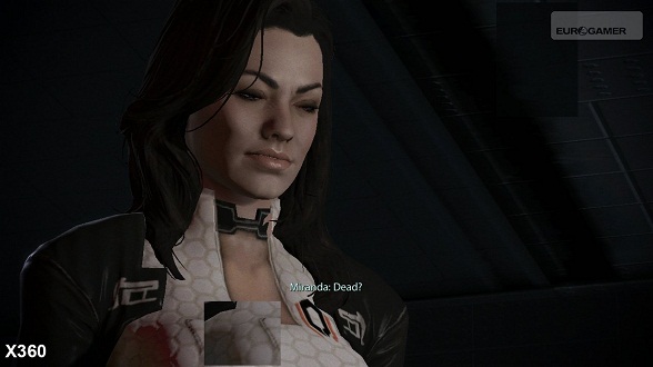 Во первых, мы четко видим что изменение освещения в первую очередь для сокрытия преступлений BioWare по надругательству над текстурами, обратите внимание что случилось с потолком - его нет. Жеванные складки на плечах особо в глаза не бросаются, зато на этом кадре хорошо видно какой даунгрейд притерпела одежда Миранды. Обратите внимание на левую от нас, пордон, сиську, точнее, на тень на ней. Если в случае XBOX 360 она рельефна, о чем свидетельствует правильная тень(о да, кто еще не понял, у прямоугольники на одеянии красавицы не рисованные, а объемные, и как оказалось на PS3 одежда имеет место быть плоской как наша земля в представлении древних людей).