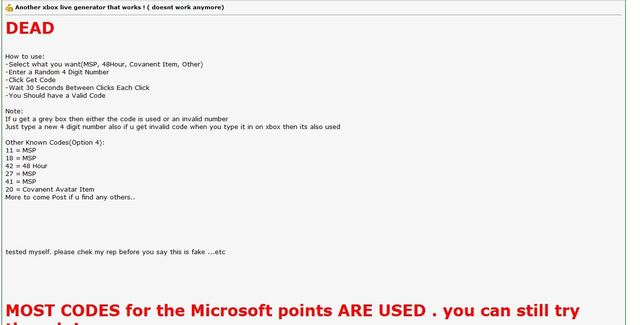 Если порыться по интернету, то можно найти программку, которая генерит коды для 160MSP, Halo Reach аватаров и 48 часового Xbox Live Trial. Причем метод очень прост и понятен даже школьнику. Ссылку на софтину можно найти, например, на xbox360iso.com