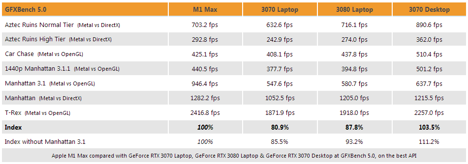 Первые тесты подтверждают невероятную мощь нового GPU от Apple, который интегрирован в его SoC. Он близок к мобильной версии RTX 3080, при потреблении всего в 60Вт (у 3080 это 160Вт)!