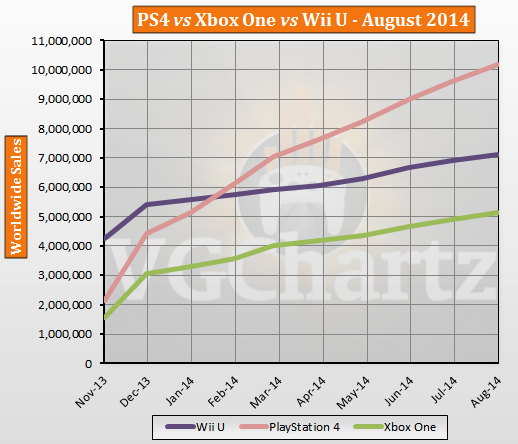 Вот и подоспели данные о продажах консолей нового поколения с первого дня их выхода и по август 2014. Картинка удручающая (для фанатов WiiU/XOne):